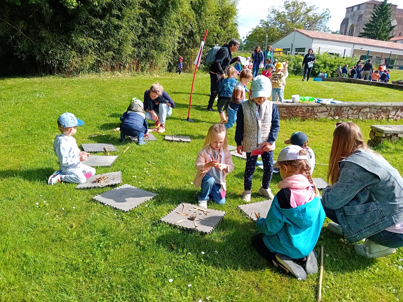 Le mardi 27 mai, les PS-MS ont accueilli les enfants de maternelle des écoles de Bazoges-en-Pareds, de Mouilleron-St-Germain, de Saint-Maurice-le-Girard et de Thouarsais-Bouildroux dans la Vallée Verte pour un temps de jeux. Chaque équipe devait compléter son petit train en réalisant un jeu de chaque pôle (pôle lapin, pôle poule…). Les enfants ont pu faire de la peinture avec de l’eau et de la terre, jouer au Molkky, faire du transvasement avec de l’eau, faire de la musique avec des éléments de la nature, ramasser les déchets…