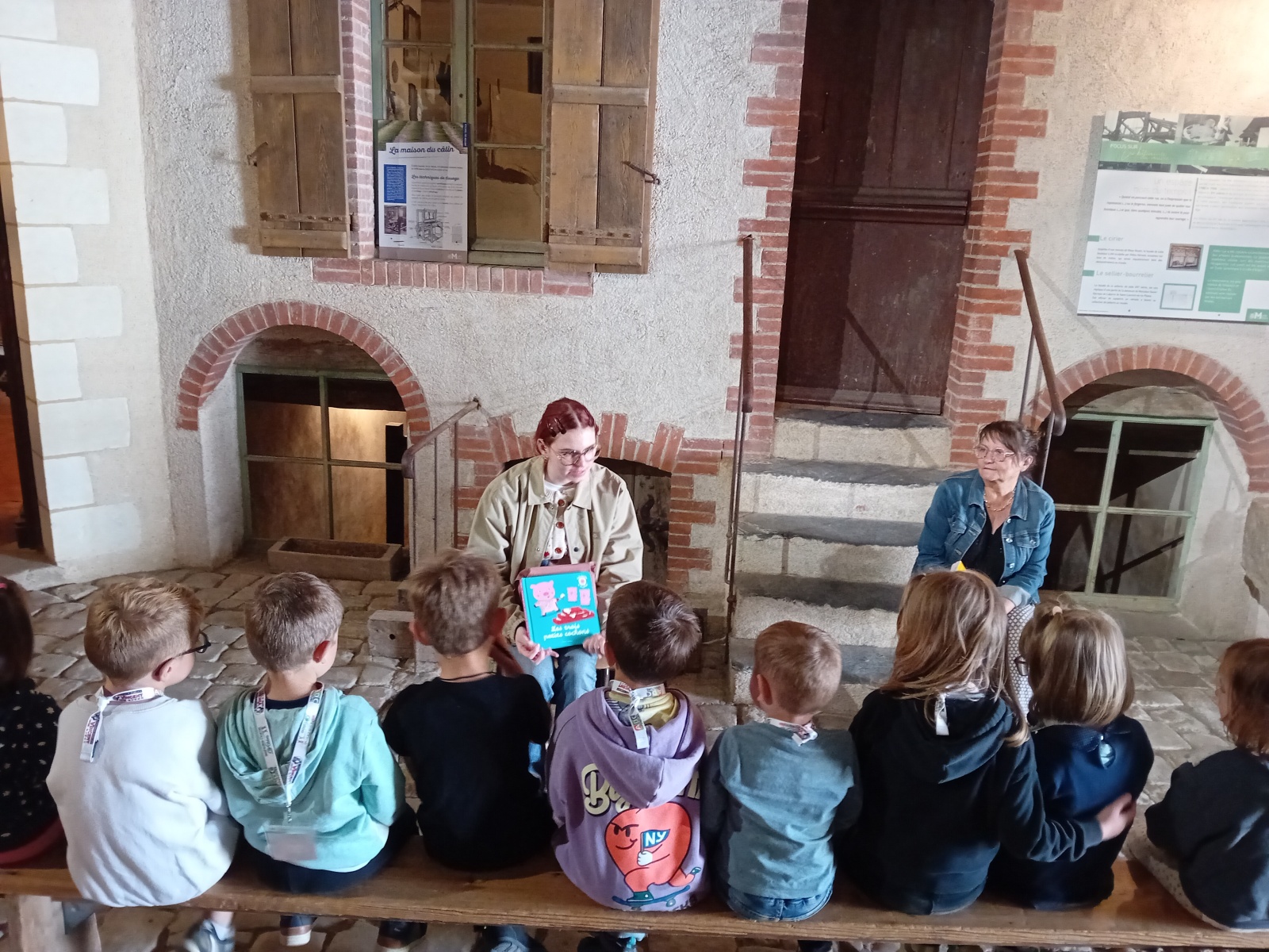 Les PS-MS-GS-CP ont pu découvrir le musée à partir de l’histoire des 3 petits cochons (pour les métiers de tisserand, de menuisier et de meunier) et l’histoire du petit chaperon rouge (pour découvrir les habits la cuisine d’autrefois).