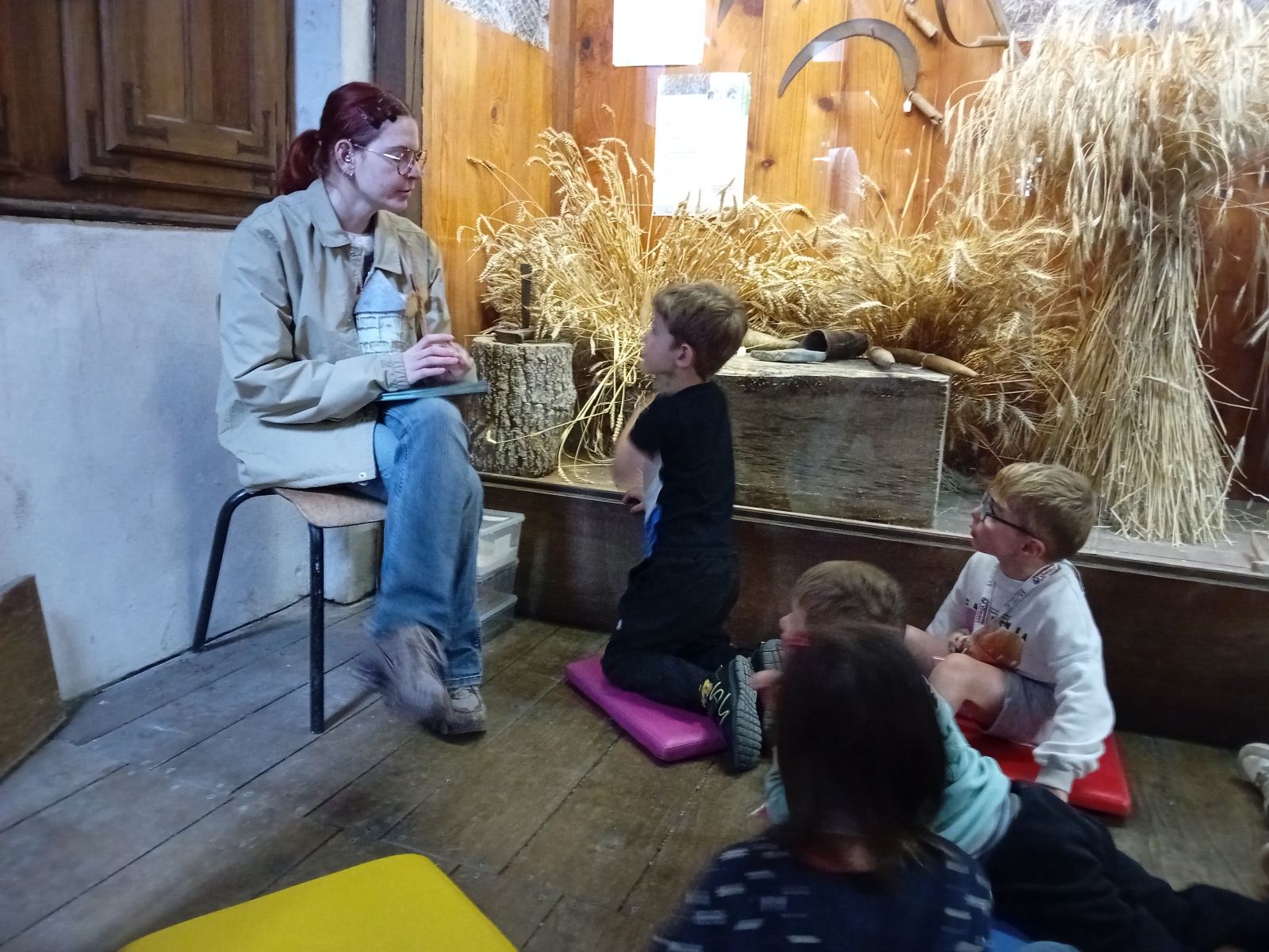 Les PS-MS-GS-CP ont pu découvrir le musée à partir de l’histoire des 3 petits cochons (pour les métiers de tisserand, de menuisier et de meunier) et l’histoire du petit chaperon rouge (pour découvrir les habits la cuisine d’autrefois).