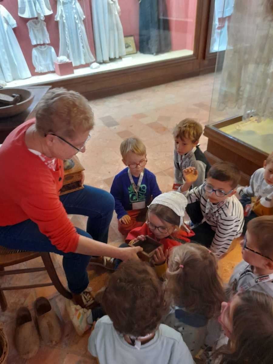 Les PS-MS-GS-CP ont pu découvrir le musée à partir de l’histoire des 3 petits cochons (pour les métiers de tisserand, de menuisier et de meunier) et l’histoire du petit chaperon rouge (pour découvrir les habits la cuisine d’autrefois).