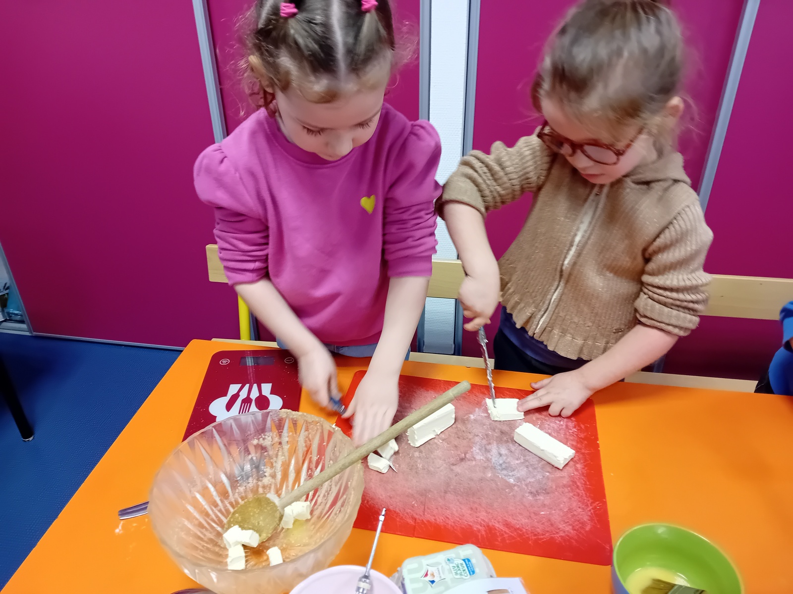 Ils ont coupé l’ananas et le beurre, ils ont mélangé la poudre d’amande avec les œufs et le sucre, ils ont déroulé la pâte, posé une fève et décoré le dessus des galettes. Les parents et les enfants ont pu se régaler lors des portes ouvertes.