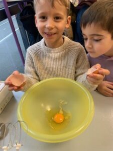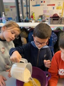 A l’occasion de la Chandeleur, la classe de GS/CP à fait des crêpes. Les plus grands ont dosé les ingrédients, puis tous ont participé à la cuisson des 152 crêpes ! (Nous les avons comptées). L’après midi après la récréation toute la classe était fière de partager les crêpes avec tous les camarades de l’école.
