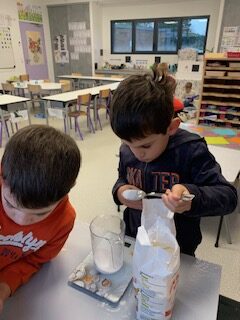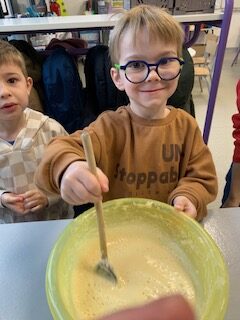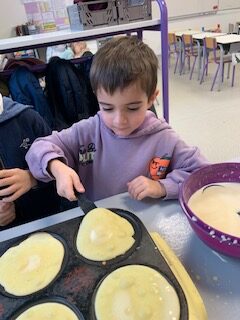 A l’occasion de la Chandeleur, la classe de GS/CP à fait des crêpes. Les plus grands ont dosé les ingrédients, puis tous ont participé à la cuisson des 152 crêpes ! (Nous les avons comptées). L’après midi après la récréation toute la classe était fière de partager les crêpes avec tous les camarades de l’école.