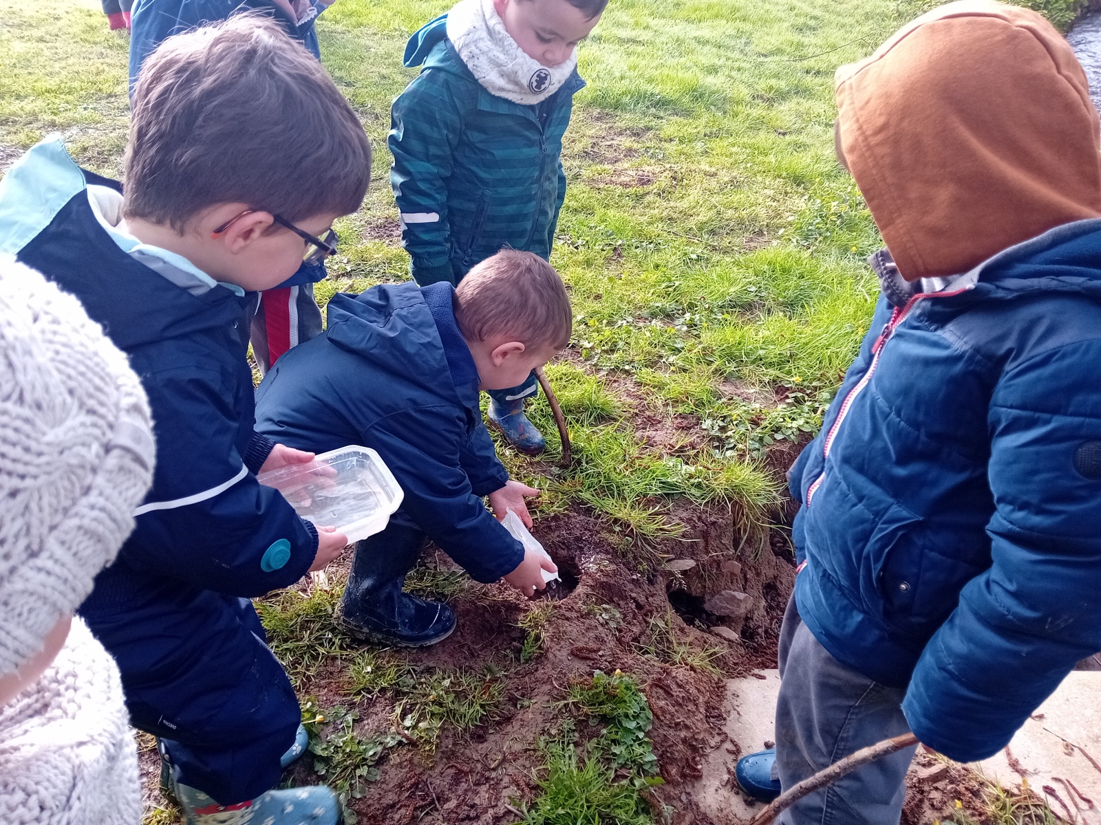 Voici quelques photos et vidéos des temps d’école dehors de mars-avril où nous avons découvert de nombreux instruments de musique, écouté les bruits de la nature, fait un Memory sonore avec des éléments de la nature, dessiné des fleurs avec de la terre et de l’eau, nous avons travaillé sur l’histoire de Pierre et le loup, nous avons appris les couleurs en anglais…