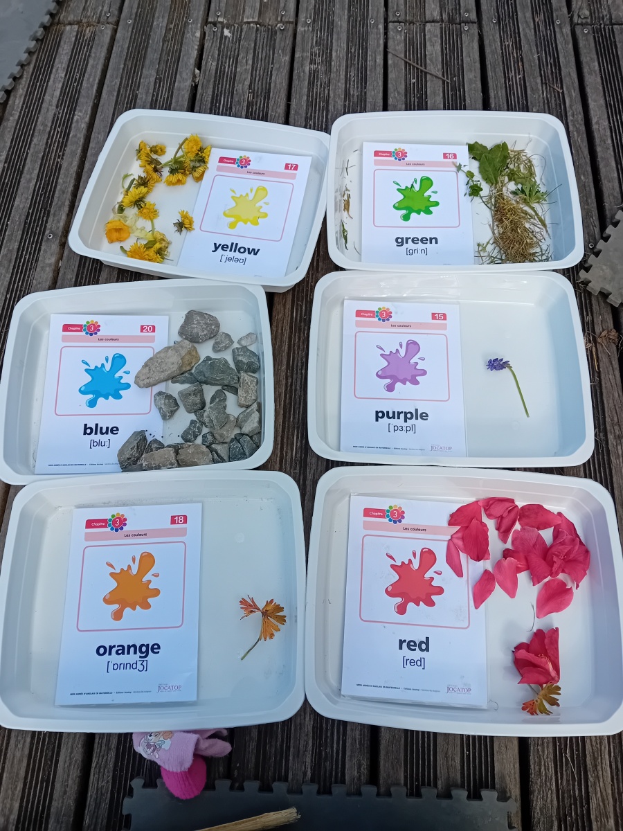 Voici quelques photos et vidéos des temps d’école dehors de mars-avril où nous avons découvert de nombreux instruments de musique, écouté les bruits de la nature, fait un Memory sonore avec des éléments de la nature, dessiné des fleurs avec de la terre et de l’eau, nous avons travaillé sur l’histoire de Pierre et le loup, nous avons appris les couleurs en anglais…